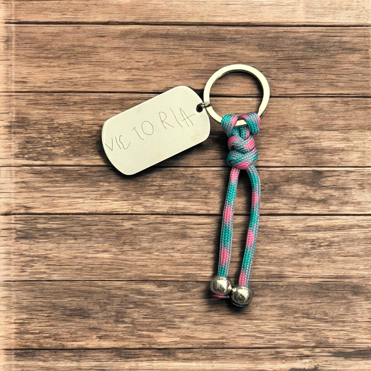 5. Montaje del llavero: Por último, ensamblamos la placa grabada con el cordón decorativo y añadimos las bolas metálicas en las puntas para rematar el diseño.